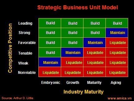 Ma trận ADL (phát triển bởi công ty Arthur D. Little), có hai nhân tố chính: Vị thế cạnh tranh (Competitive Position) và Quá trình trưởng thành của ngành (Industry Maturity). Sự kết hợp giữa hai nhân tố này có tác dụng thúc đẩy quá trình ra quyết định chiến lược của Doanh nghiệp. Ma trận ADL thường sử dụng để phát triển chiến lược cho các đơn vị kinh doanh (SBU) nhưng cũng có thể dùng cho các dòng sản phẩm hoặc sản phẩm, chúng được phân loại và đặt vào các ô tương ứng với vị trí trên ma trận.